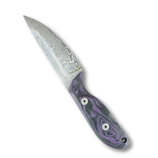 Custom Damascus Fixed Blade Knife - Purple/Black G10 Burl Handle